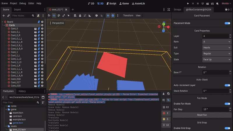 - The Pivot: I forced a massive refactor. We moved to a scene-based architecture where every card type (Regular, Wild, Runner) has its own scene and materials for front/back faces, along with clearly defining the flow of the game (main game scene, which loads level scenes, which contain boards and decks as children).